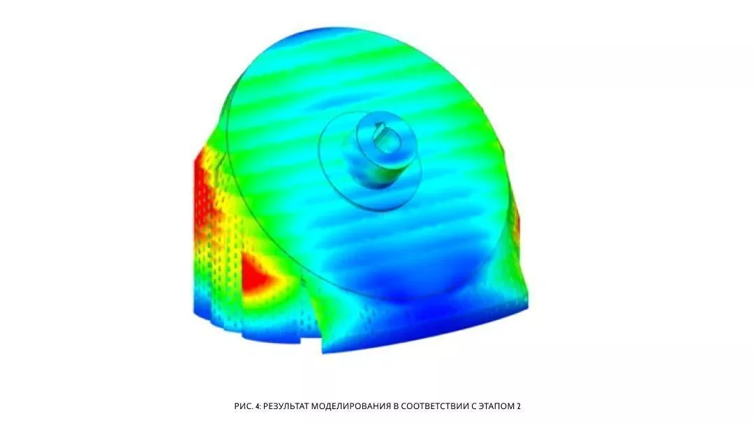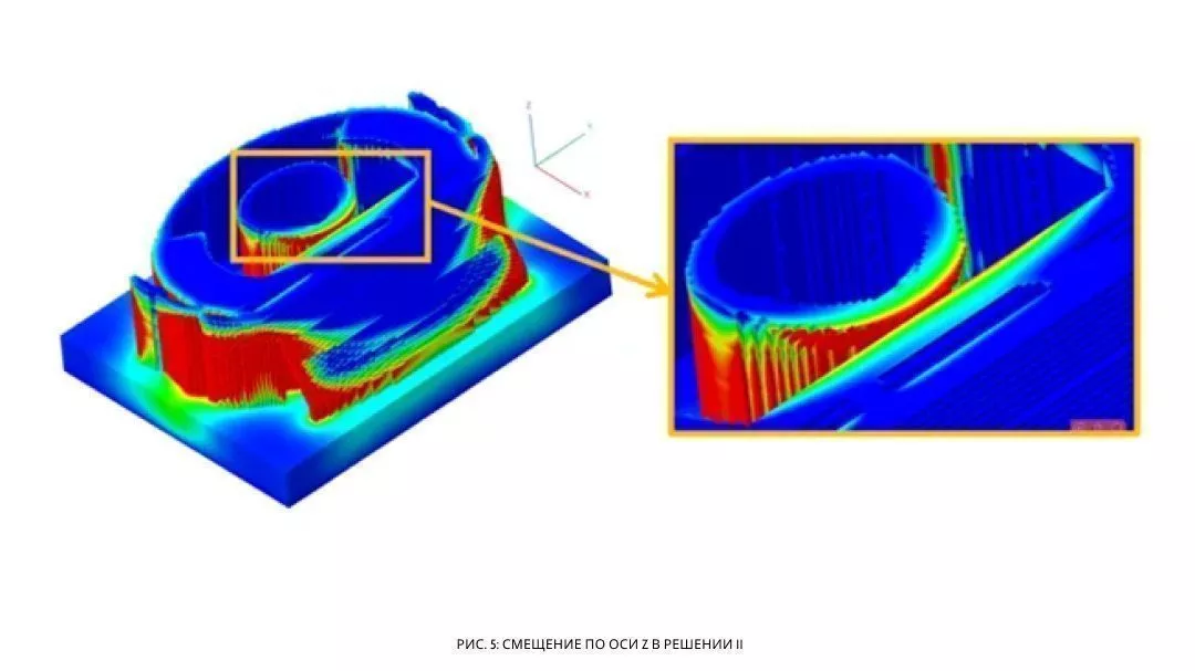 Основываясь на опыте работы с лазерной стереолитографией (SLA), инженеры разработали поддерживающие конструкции. Они создали минимальную поддержку (рис. 2) и провели моделирование процесса в новом модуле VoxelDance Engineering. В процессе моделирования было установлено максимально допустимое смещение детали на 0,5 мм и масштабирование деформации с коэффициентом 3 (рис. 3). Участки детали, находящиеся за пределами допустимого смещения, были выделены красным цветом.