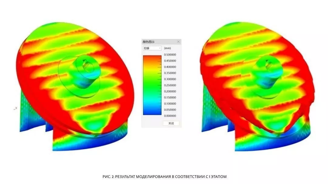 Инженеры добавили поддержки в местах наибольших деформаций (рис. 4) и провели вторую итерацию моделирования с максимальным допустимым смещением на 0,5 мм (рис. 5).