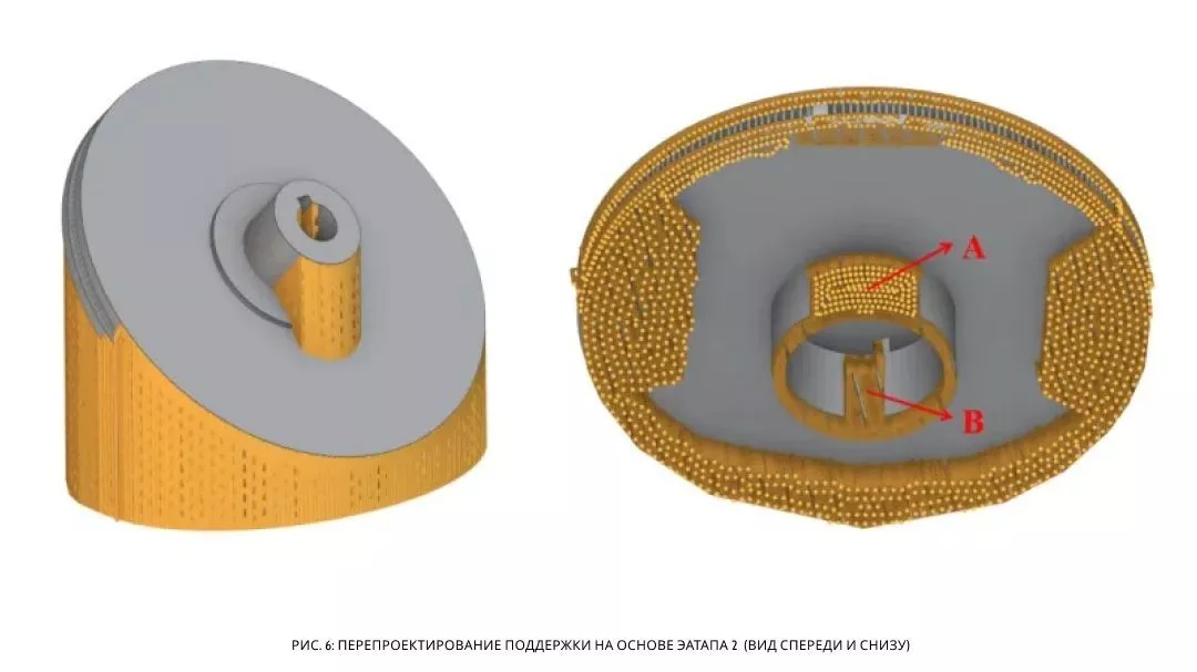 Чтобы избежать поломки лезвия рекоутера, были добавлены поддержки в точках A и B (рис. 6). Моделирование показало, что деформации по оси Z находятся в пределах допустимых отклонений (рис. 7), а анализ лицевой поверхности крыльчатки не выявил никаких короблений. Модель крыльчатки была напечатана без ошибок и трещин, что подтверждает точность программного обеспечения (рис. 8).