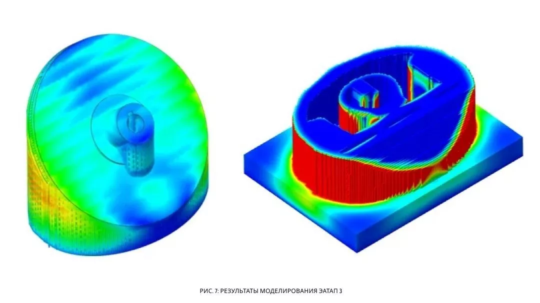 Моделирование показало, что деформация контролируется в пределах допуска, однако было обнаружено значительное коробление по оси Z, превышающее толщину одного слоя (рис. 6). Это может привести к столкновению лезвия рекоутера с деталью и сбою процесса.