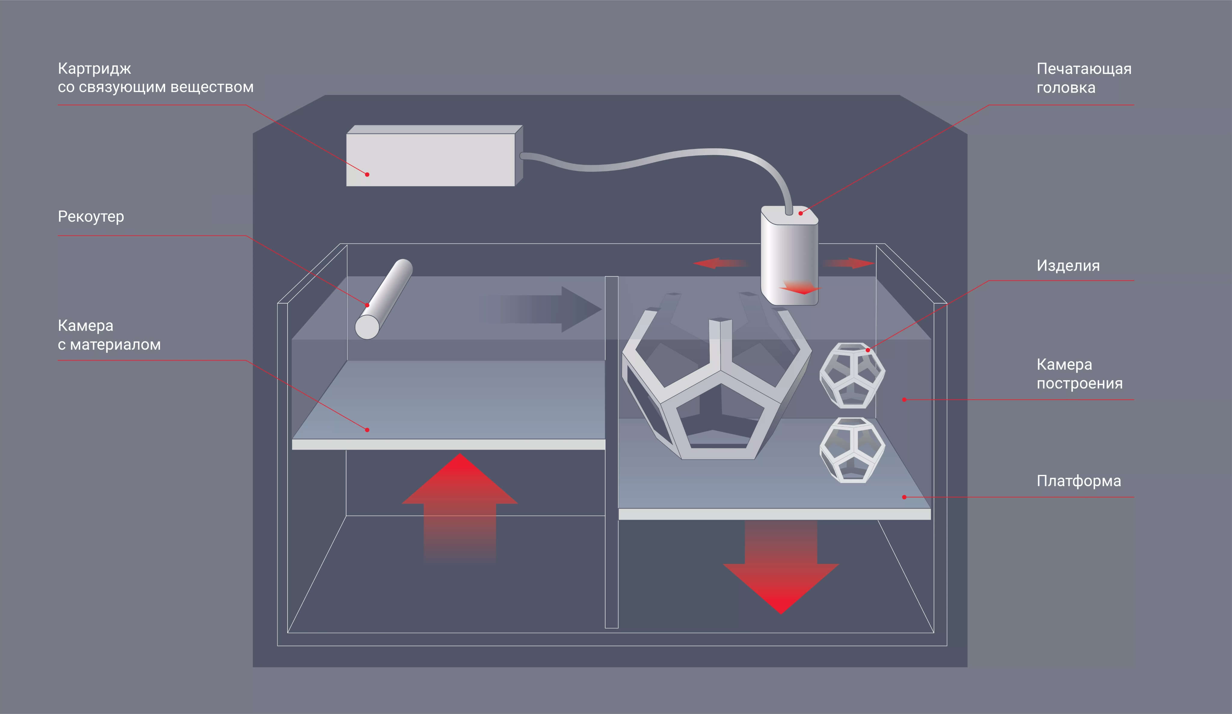 В камере построения 3D‑принтера рекоутер разравнивает порошок до образования тонкого слоя, после чего печатающая головка наносит на слой связующее вещество. Затем порошок наносится повторно, и процесс повторяется.