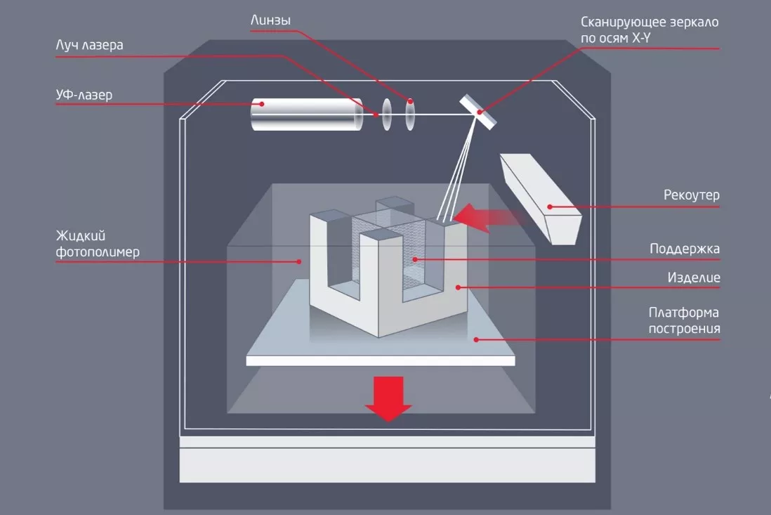 SLA (Stereolithography Apparatus) - технология лазерной стереолитографии, основанная на послойном отверждении жидкого материала под действием луча лазера